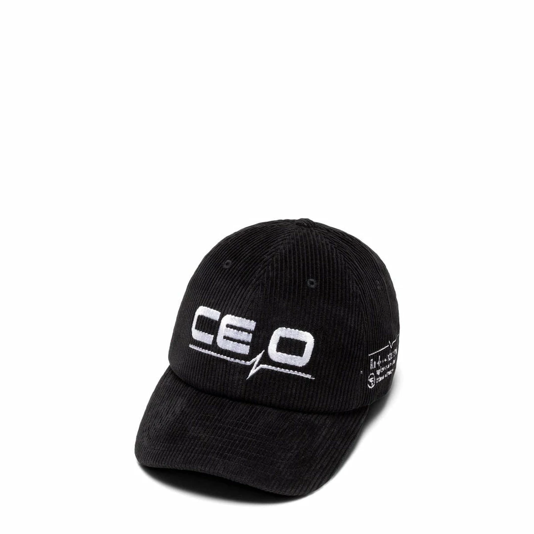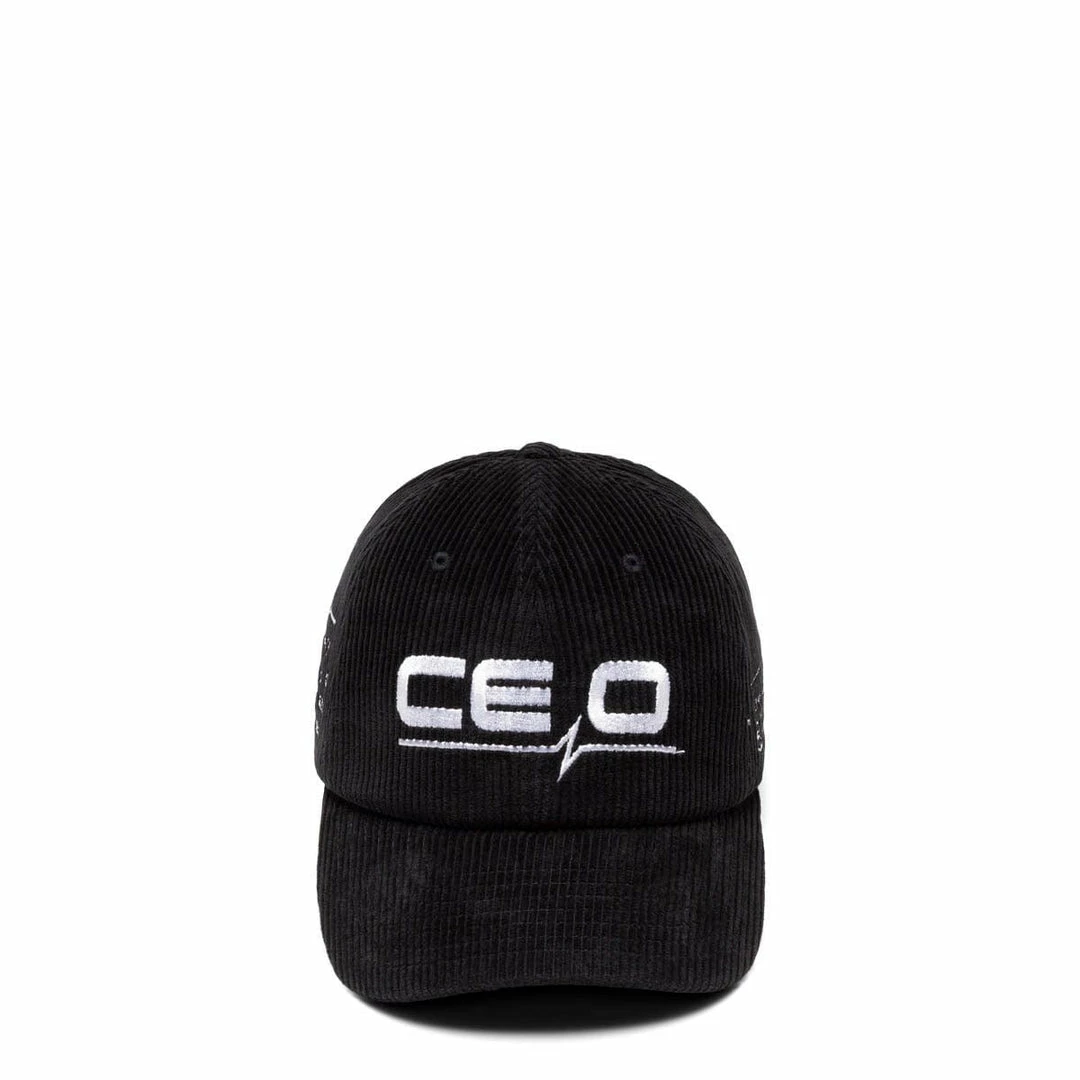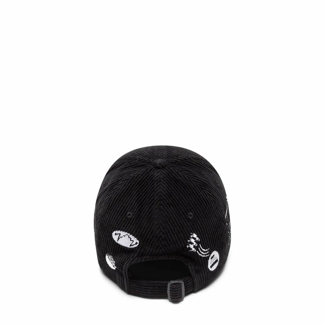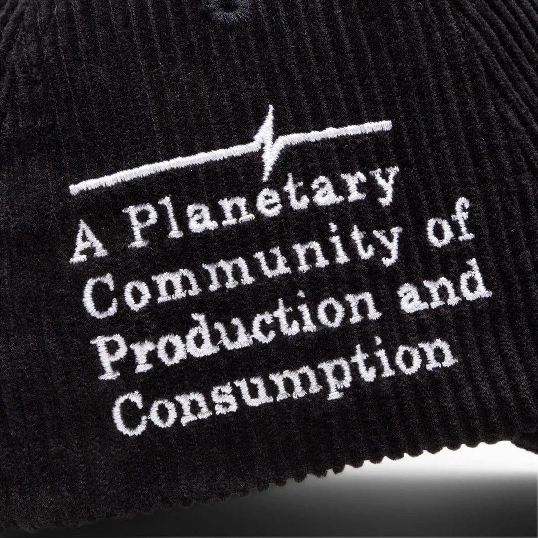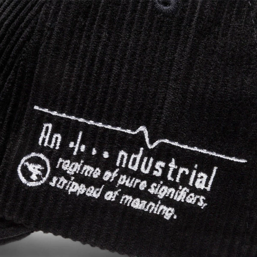Following a dark, post-futuristic aesthetic, this corduroy hat confirms great attention to detail and pushes designs that tell the story of our decadent capitalist society.