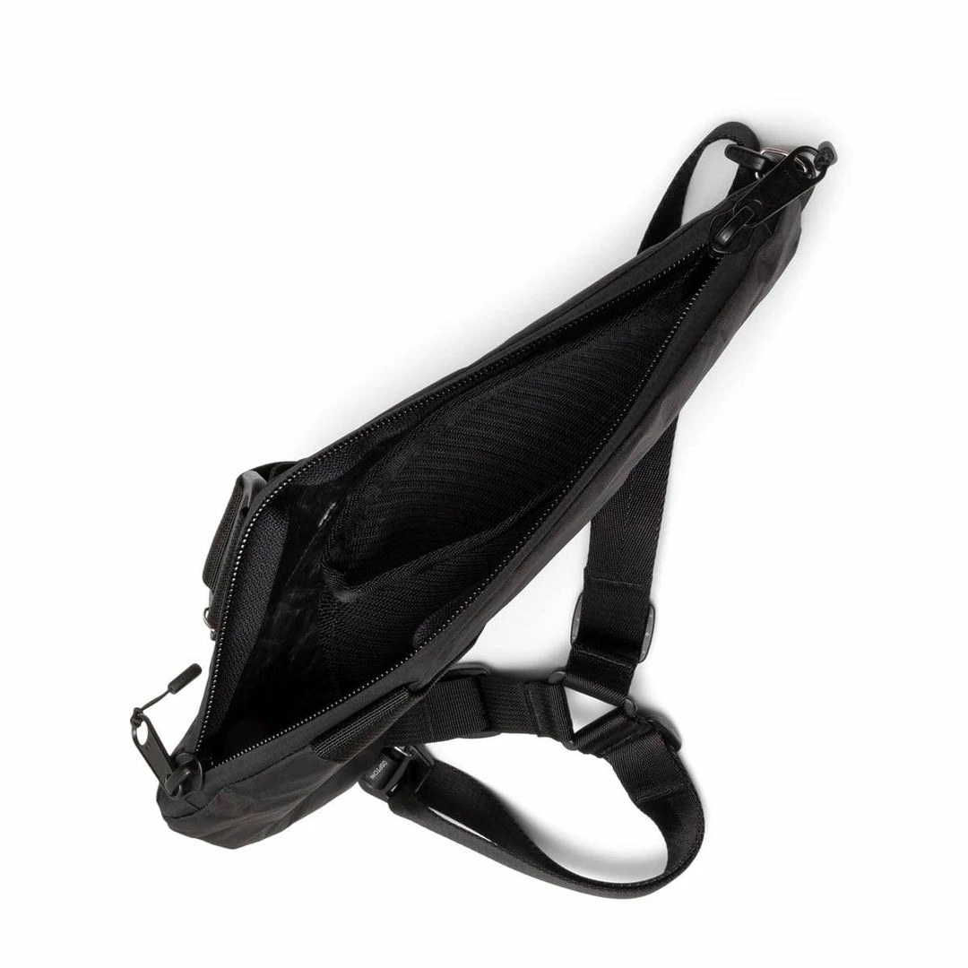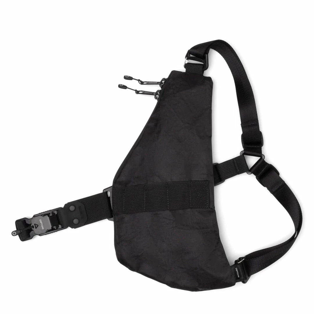 The crescent-shaped Unit Vertical Pouch allows for subtle and minimal storage of your essentials under your jacket, while still making it easy to access.Β This reversible pouch is constructed out of 5.0 oz DyneemaΒ and can be worn on either side of the body (the strap must be rotated when switching orientations).Β Three point strap allows the bag to wrap around your upper chest, while the Fidlock V-Buckle tightly secures the webbing that wraps around the other side of the body.Β Other details include YKK Aquagaurd zippers, DSPTCH icon zipper pulls, inside phone sleeve (sized for a Plus-size iPhone), and a 3M RND Label.