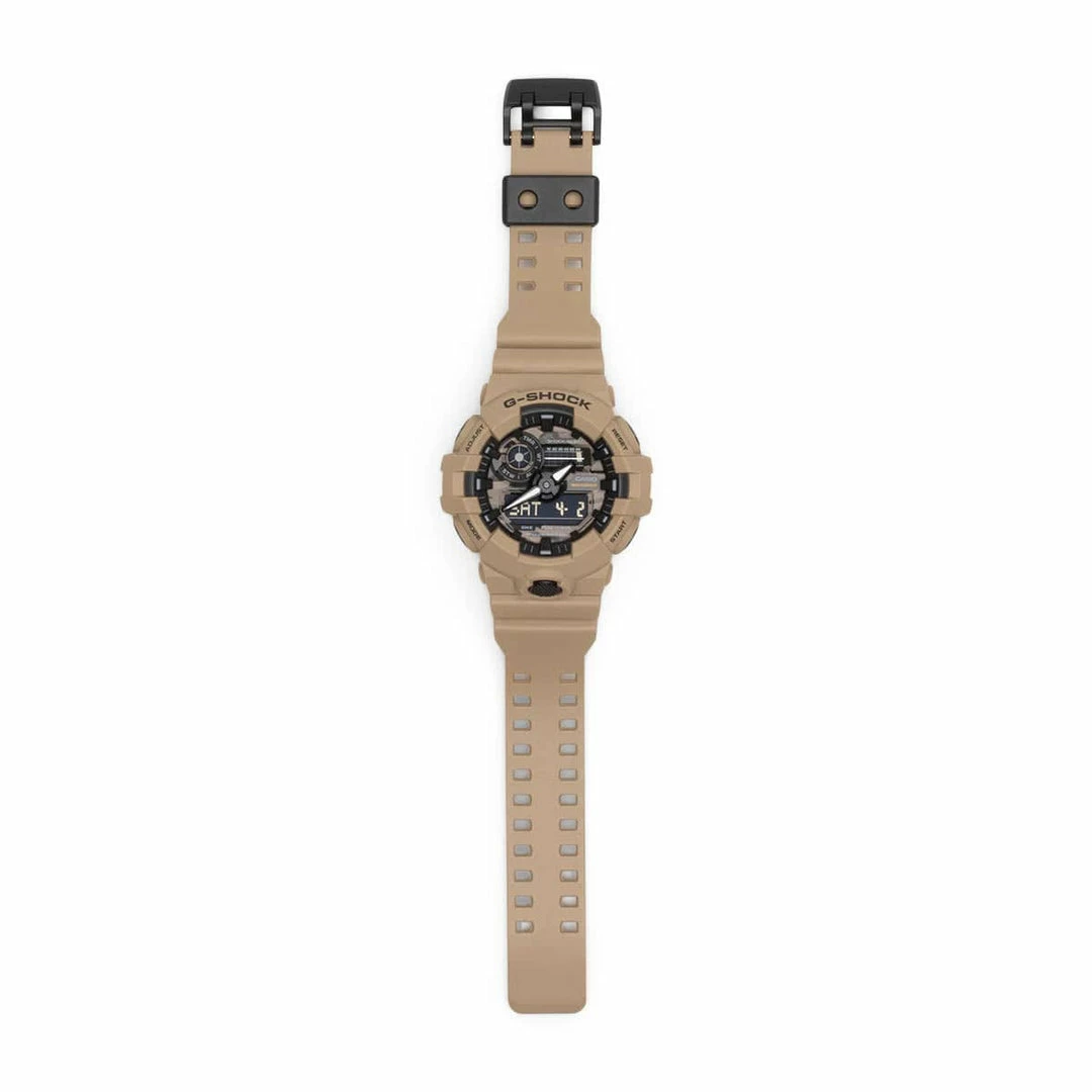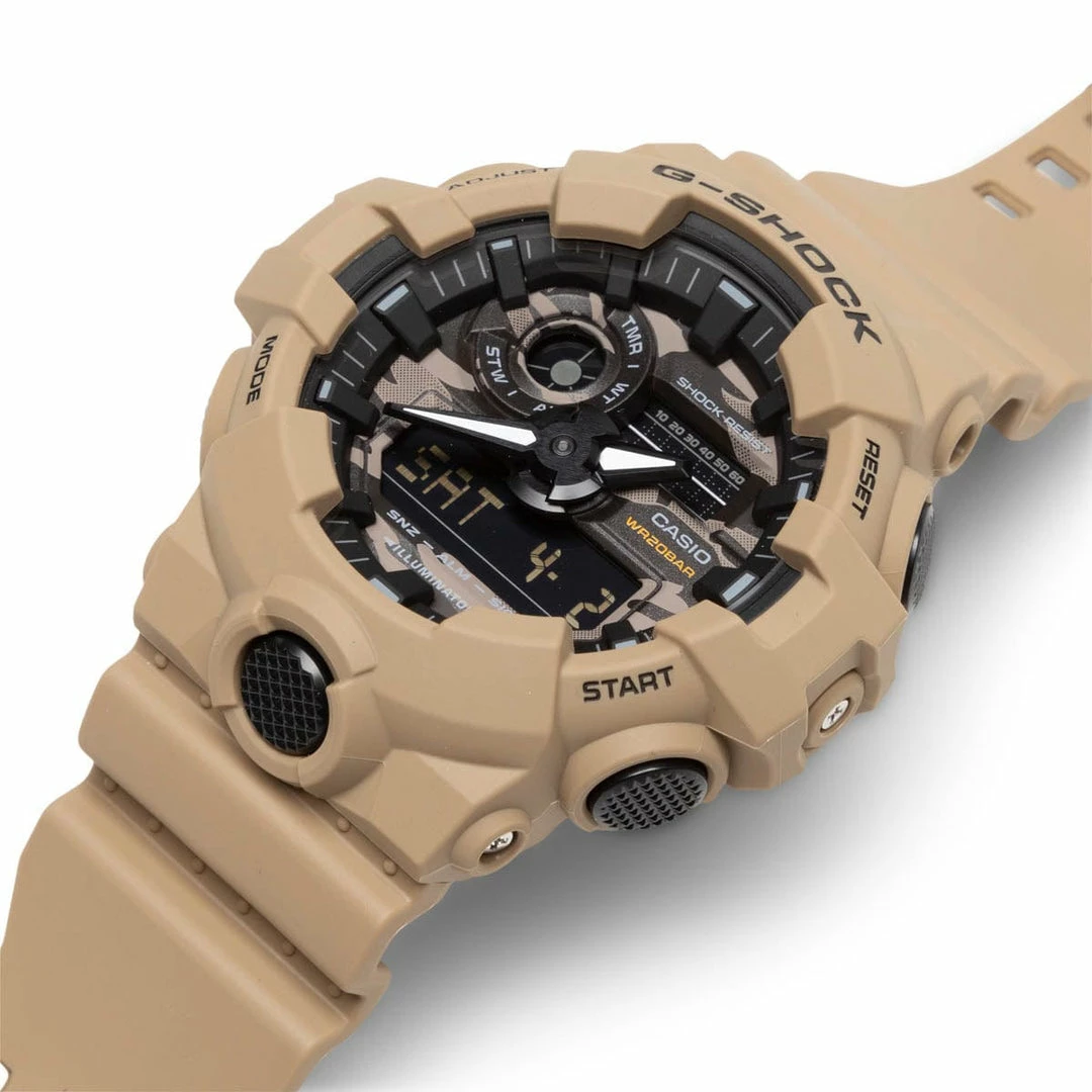 The GA700CA-5A is a watch that goes with you all the way from the wild outdoors to the inner city, in just-right colors that fit in anywhere. Featuring an original G-SHOCK camouflage motif on the dial.