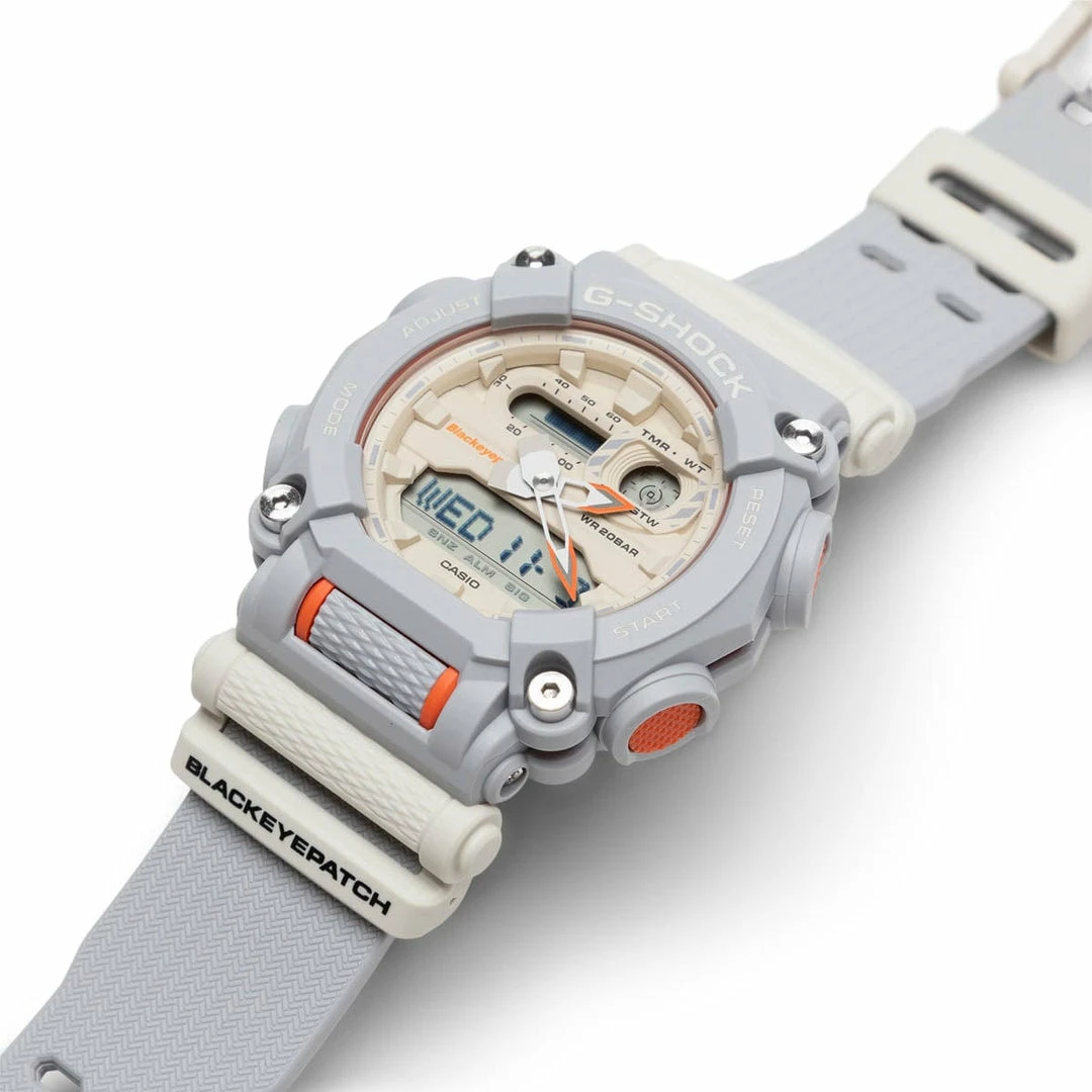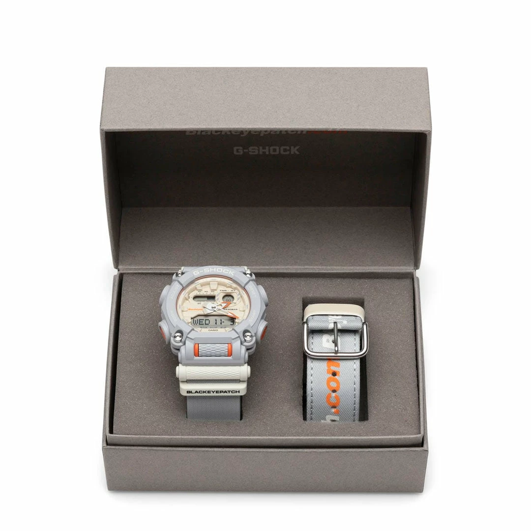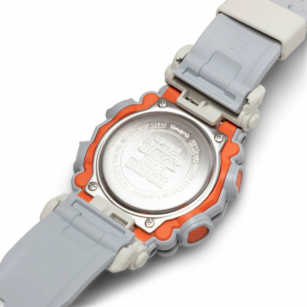 This special collaboration incorporates an industrial design in homage to the rugged GA900, a watch equally at home in challenging terrain or on a stylish street. Orange accents pop against a gray base, evoking the clean, minimalist look of industrial workwear. Add in the iconic BlackEyePatch 取扱注意 (“Handle with Care”) motif for a uniquely tough G-SHOCK with a singularly timeless style.