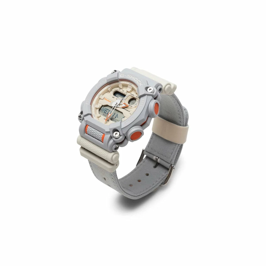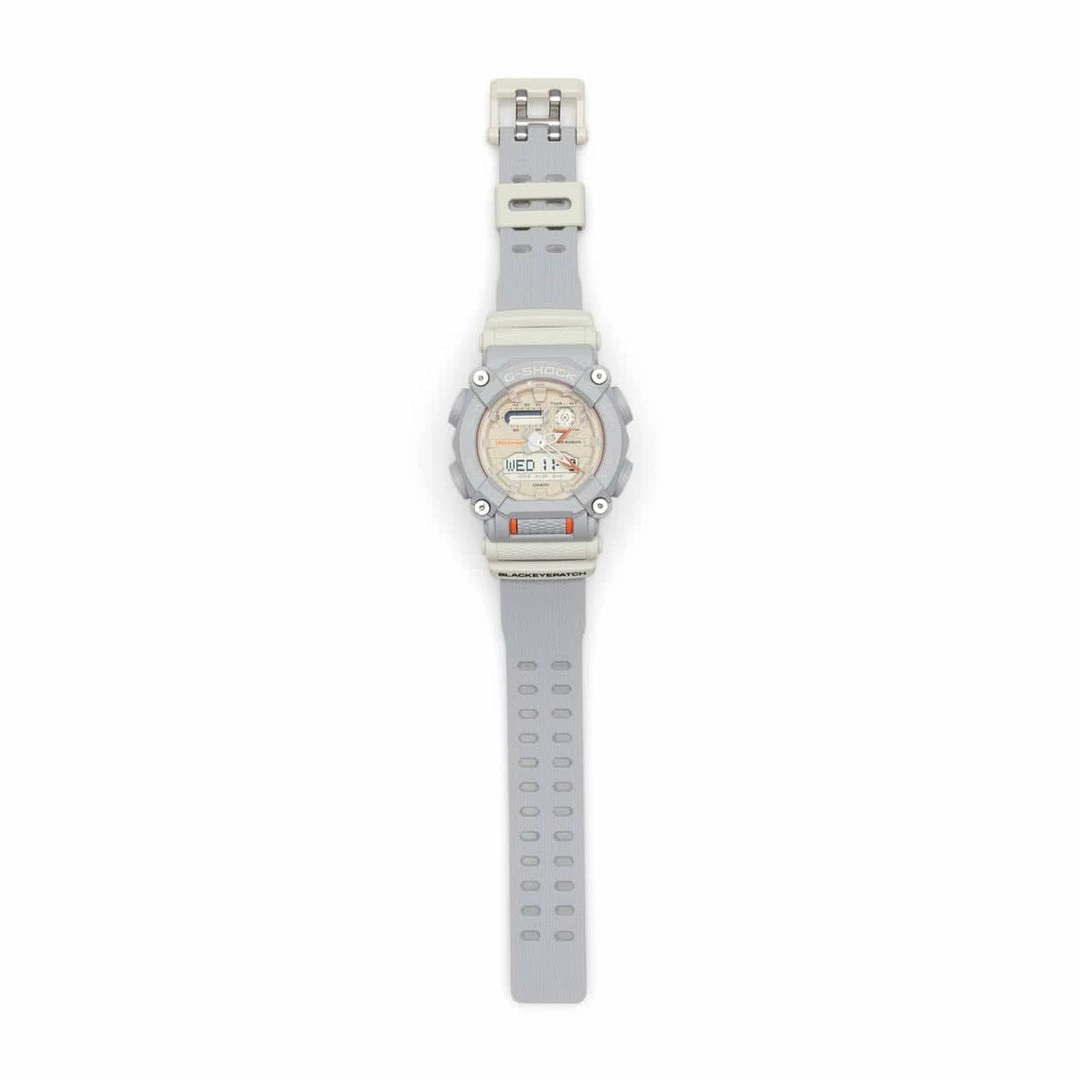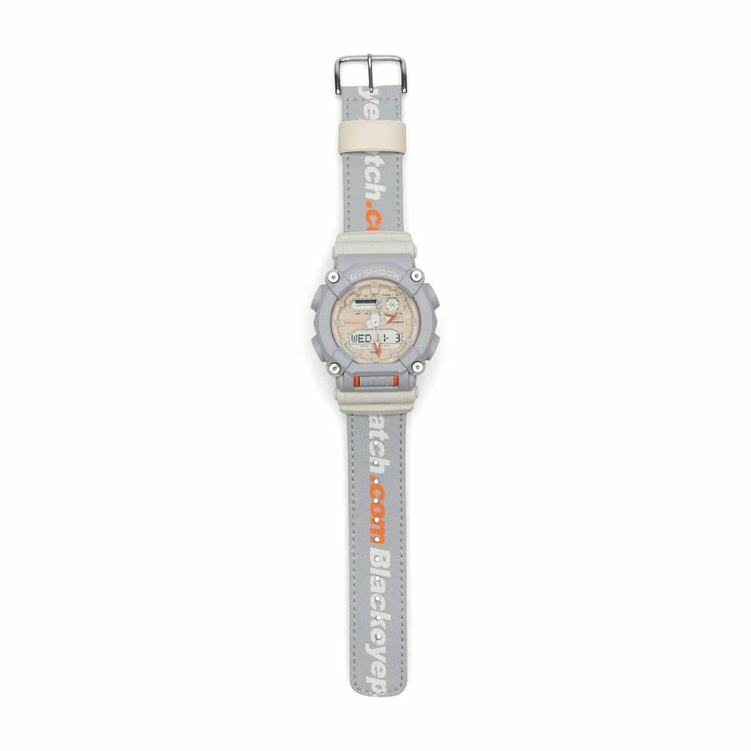 This special collaboration incorporates an industrial design in homage to the rugged GA900, a watch equally at home in challenging terrain or on a stylish street. Orange accents pop against a gray base, evoking the clean, minimalist look of industrial workwear. Add in the iconic BlackEyePatch 取扱注意 (“Handle with Care”) motif for a uniquely tough G-SHOCK with a singularly timeless style.