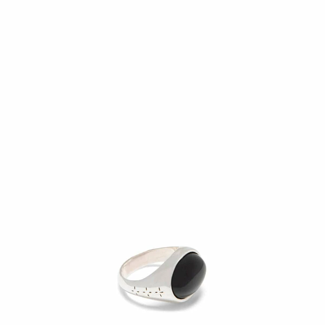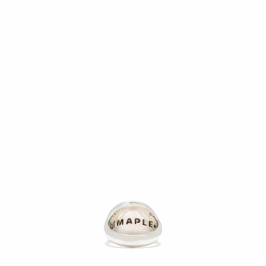 The Tubby ring is a silver 925 oval signet featuring an M detail on the side as well as our bandana print on the other. The horizontal stone setting makes the Tubby look unique compared to a traditional oval signet that is set vertically. Hallmarking and MAPLE logo inside.