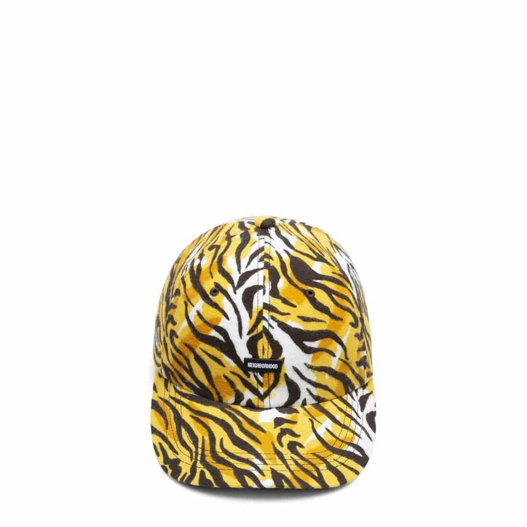Dad cap tiger stripe print cap constructed with flannel fabric. Logo on front and brand label on right side. Adjustable strap on back.Β