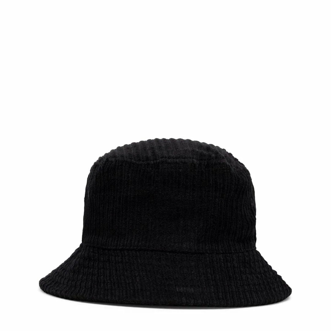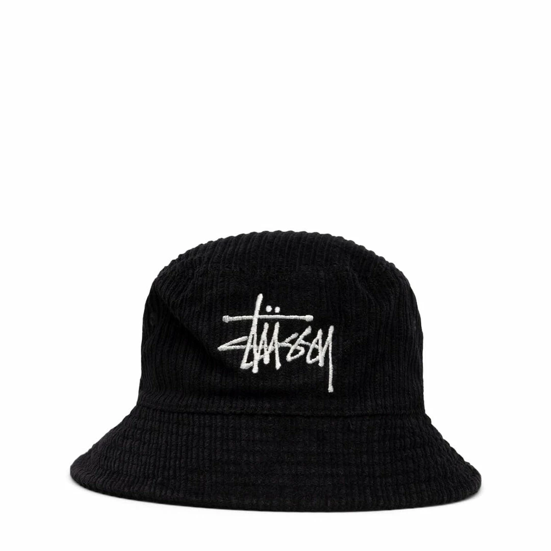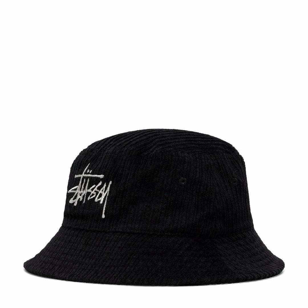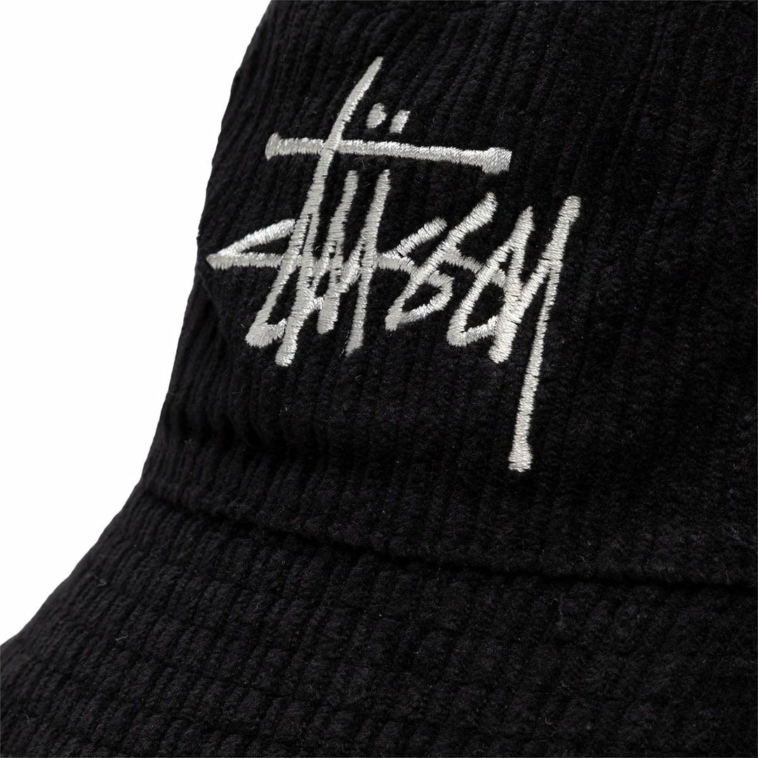 Corduroy bucket hat Stüssy logo embroidery. Unstructured crown and woven eyelets.