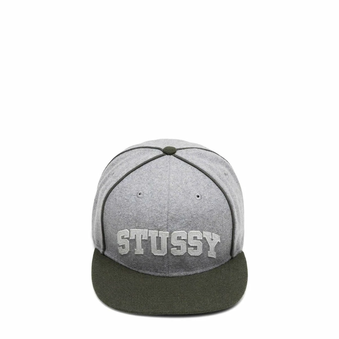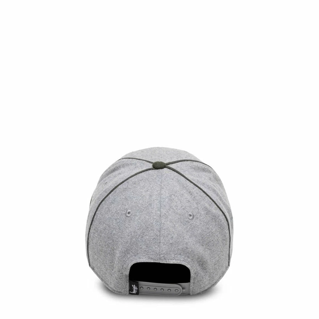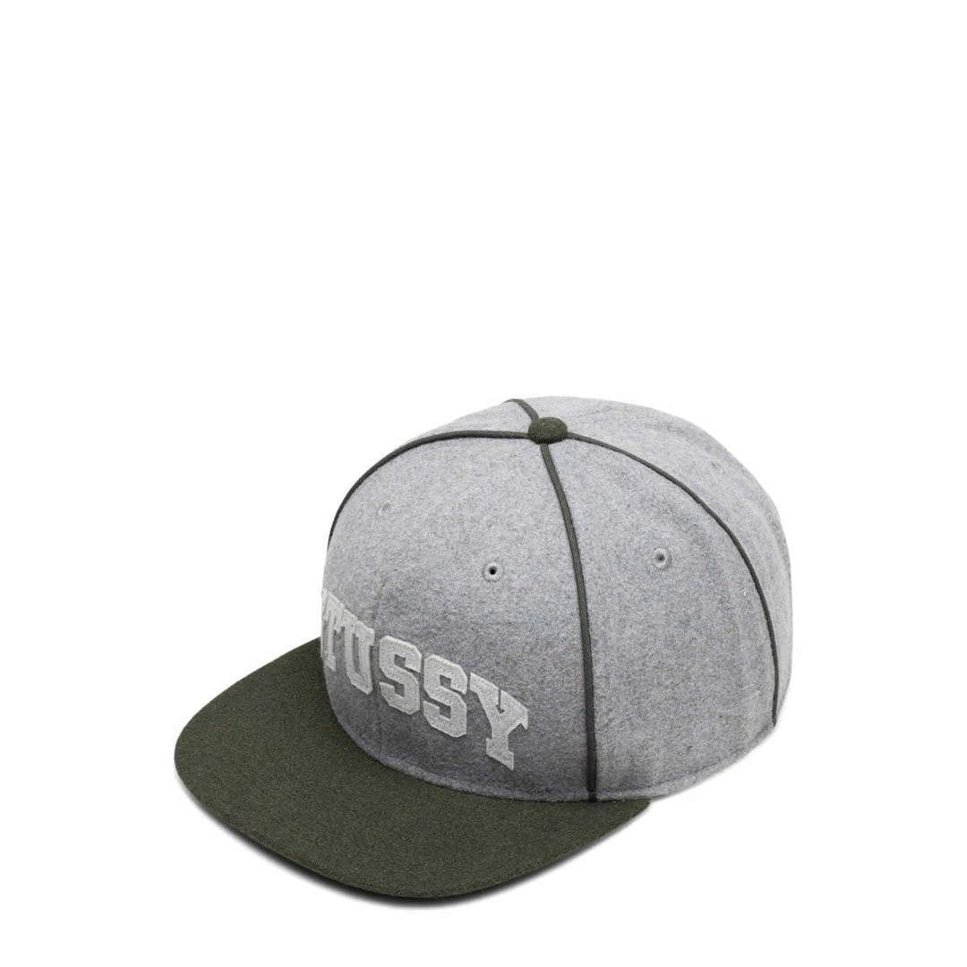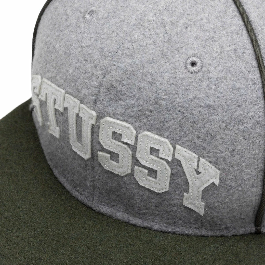 Melton 6-panel ball cap with Stüssy arch logo embroidery. High crown, piped seams, woven eyelets, and snapback closure with woven flag label at back.