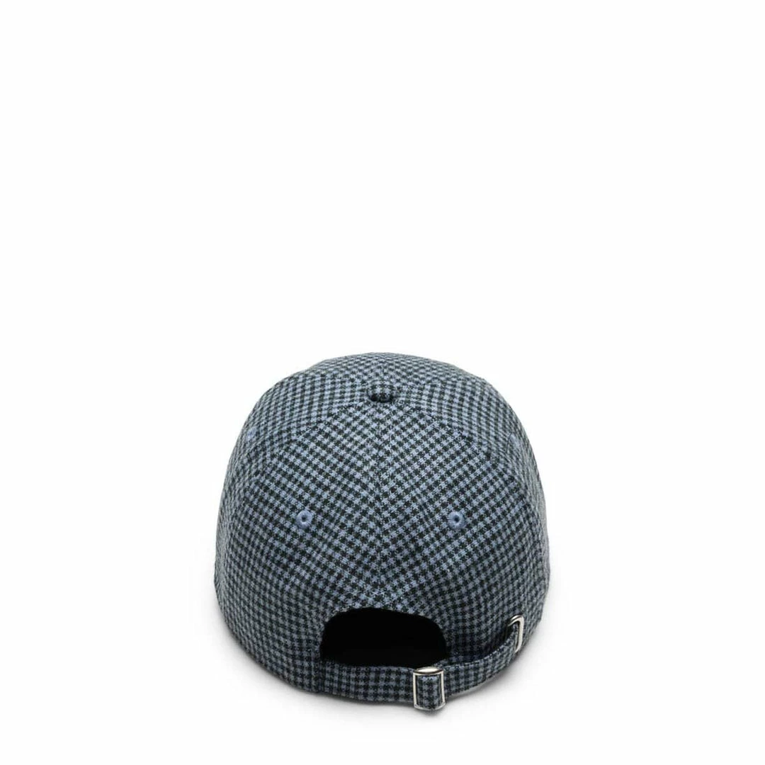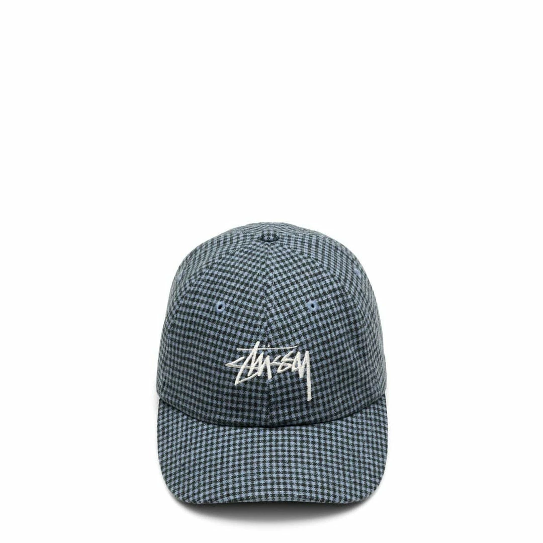 Wool check 6-panel cap with Stüssy big stock logo embroidery. Unstructured low-profile crown, woven eyelets, and self-fabric strapback closure with metal hardware.