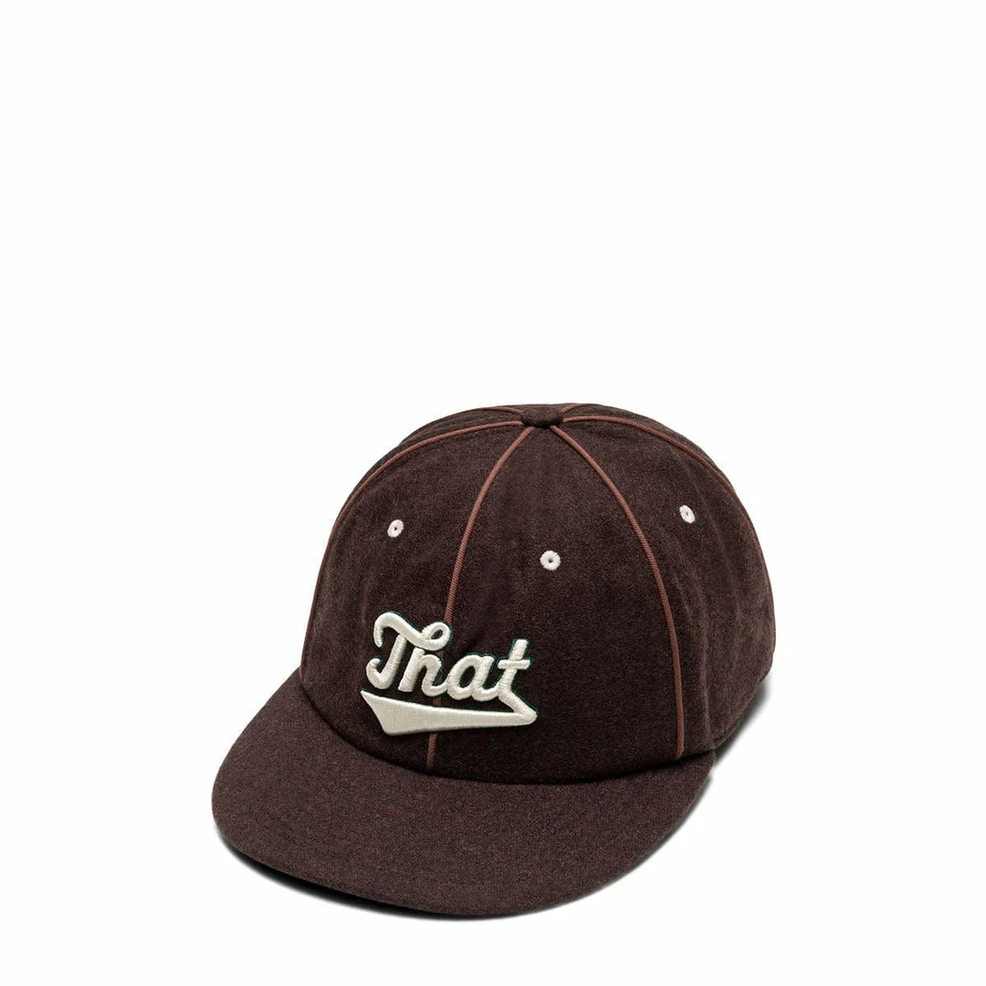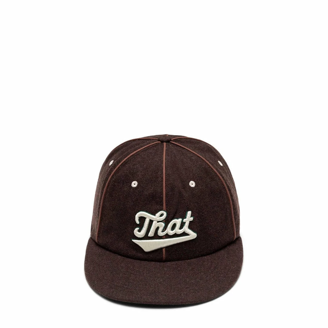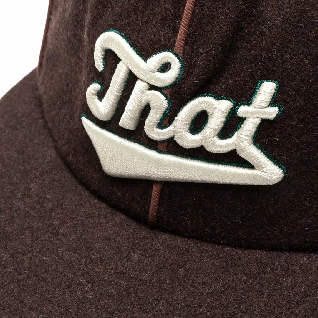 The T-Logo Cap comes inΒ dark brown with an embroidered “That”.