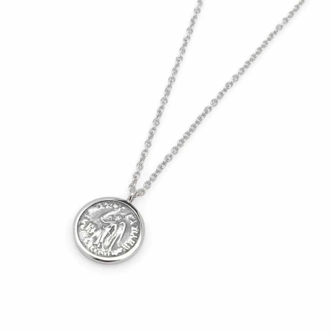 The Coin Pendant Angel is made in 925 sterling silver with a slightly oxidized coin. The pendant is cast from an authentic ancient Greek coin.