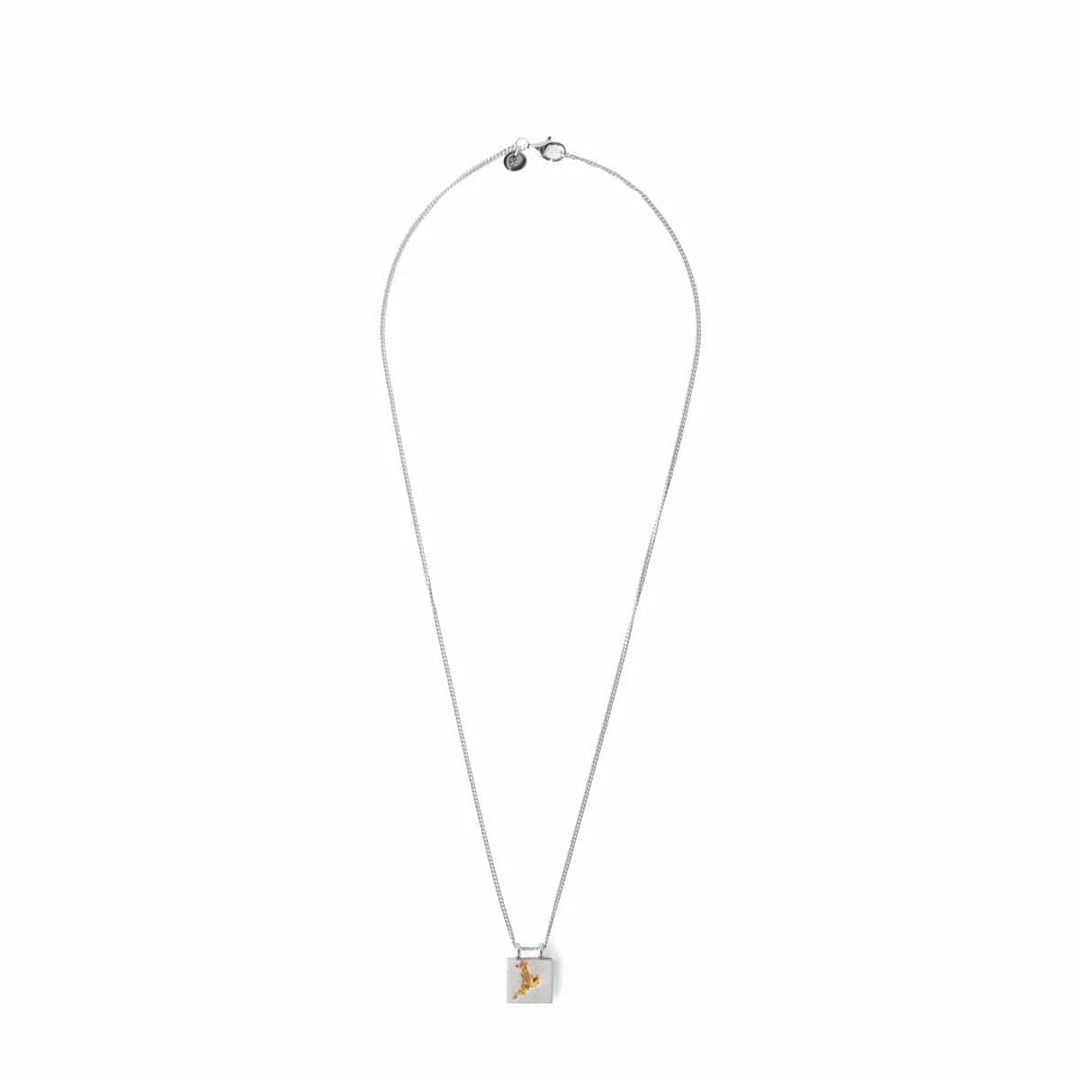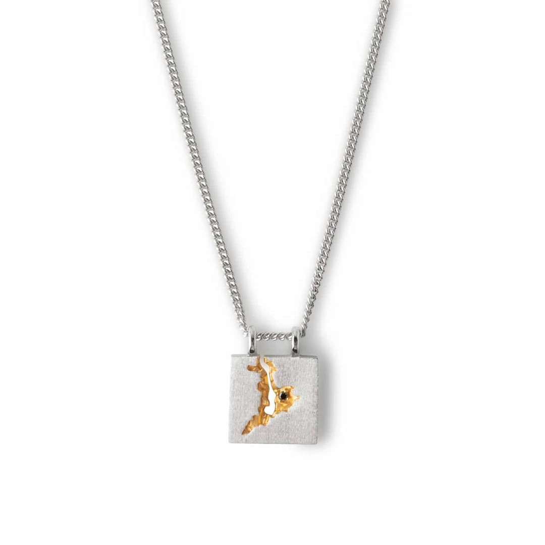 Inspired by the rocky coastline of Norway against the clean surface of the silver ocean, The Mined Pendant leaves a rawness to our classic pendants. β The rough groove with a handset black diamond reminds us of the beach flowers that grow inside the rock slopes, leading down to the sea.